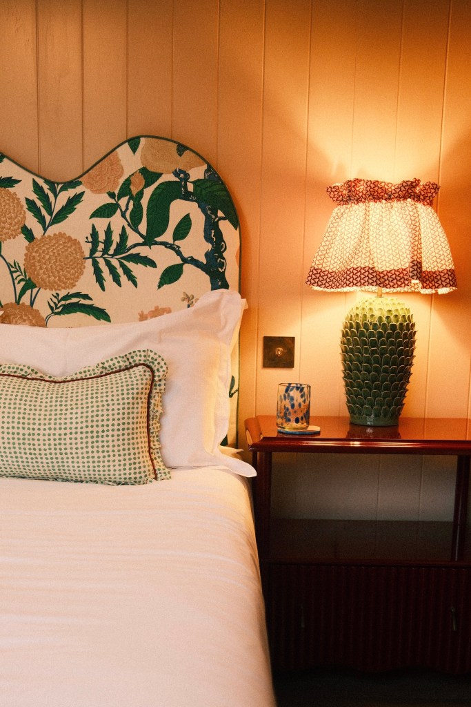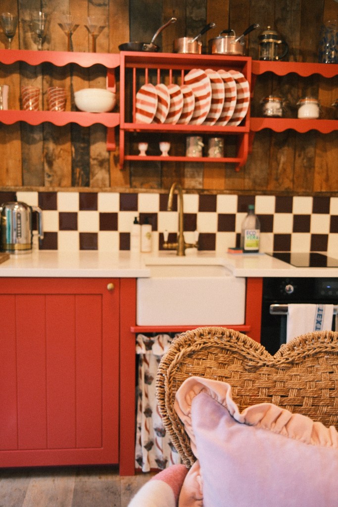Of the four cabins, we chose Kittylands – the pink one! Sam, the owner and creative force behind the interiors, has perfected every detail. From the Beauvamp lampshade and Matilda Goad hardware to the hand-painted welcome hamper, every touch felt carefully considered. Feather-filled cushions and bespoke upholstery came together in joyful pattern clashes, while the spacious en-suite offered all the comfort of boutique hotel.