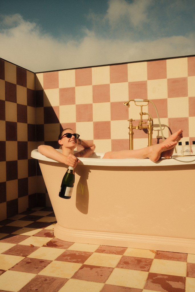The skies cleared up, so we seized the moment for an outdoor bath. Racing back to turn on the taps, we popped the champagne, and basked in the our little window of sunshine. A true Ab Fab moment – Patsy would be proud.