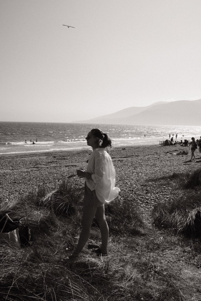 Before plunging into the surprisingly warm Atlantic Ocean, I captured Bobby under the sun – sea breeze in her hair, the Mourne Mountains behind her, seagulls circling overhead.