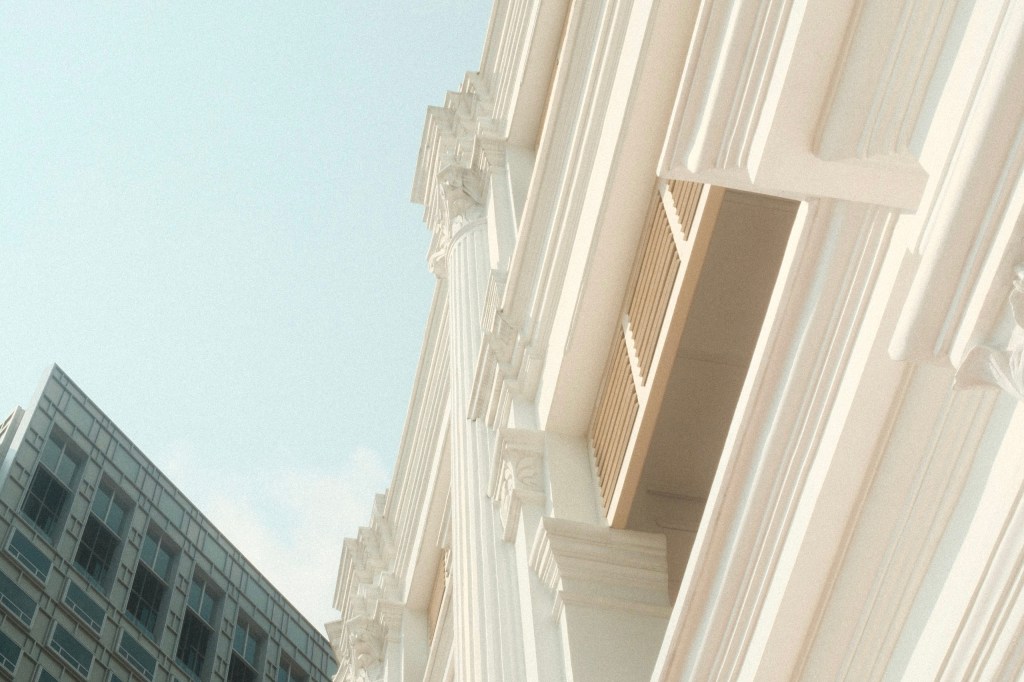 There’s something soothing in the contrast between the traditional architecture of the Raffles facade and the modern tower block behind it.