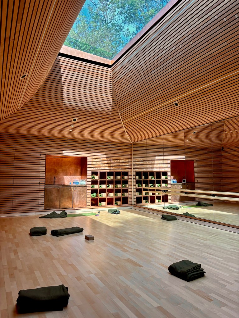 Nestled amongst the main hotel grounds, the yoga studio hides behind a small walled garden. An architectural masterpiece in itself, the limestone exterior and copper shingle roof blends seamlessly with nature yet takes your breath away at the same time. As you enter, you’re enveloped by the beech cladded walls, your eyes drawn up to the singular window, a skylight which frames the trees and sky.