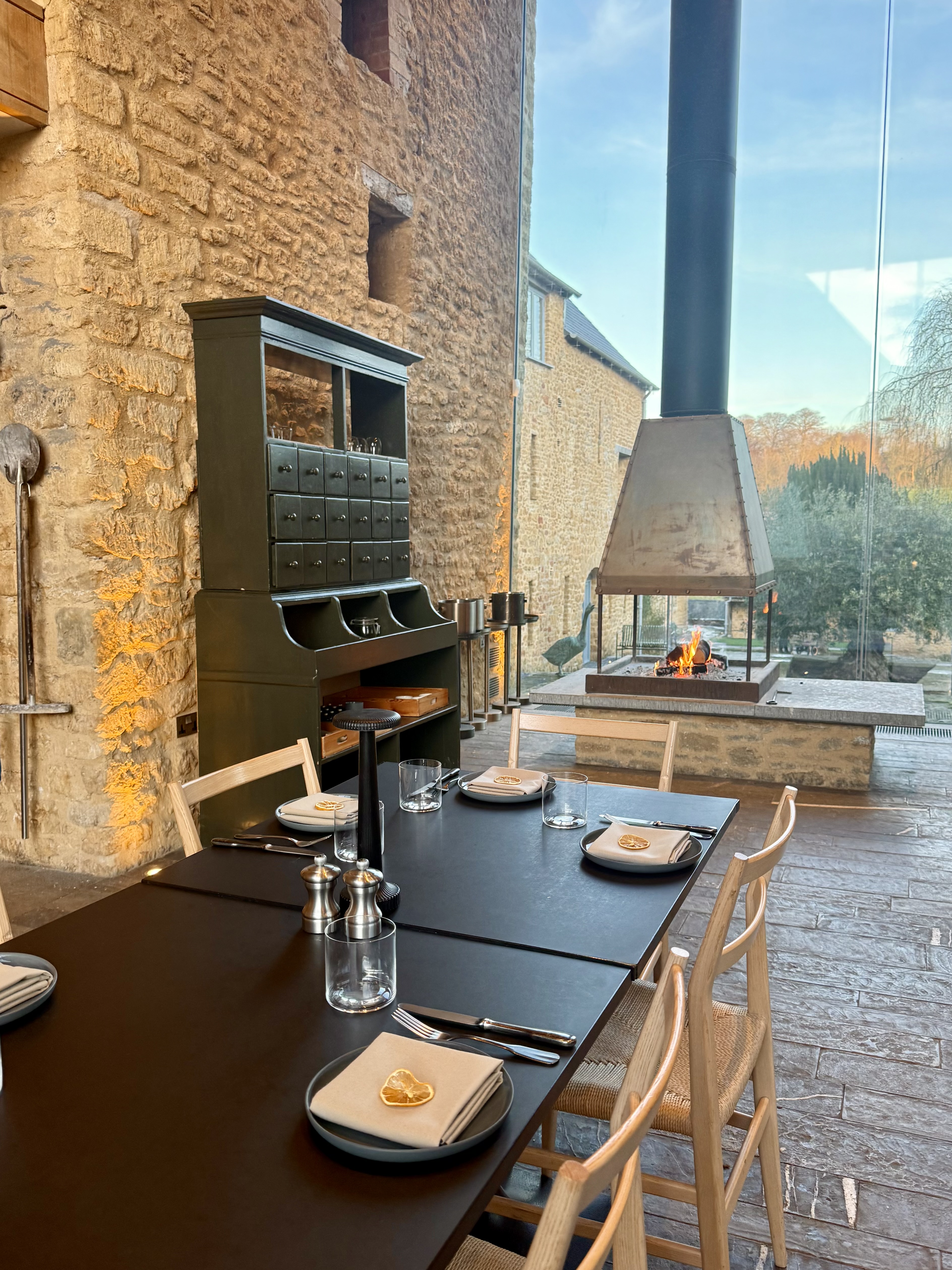 Gear up the golf buggy and enjoy the spectacular sight of Hapsden House from the path, say hi to the cows grazing as you pass and gently inform to whoever is in the drivers seat to “TAKE IT EASY” over the cattle grid. Once you’ve gathered yourself after your journey, enter the Farmyard Kitchen. Although the structure is almost all glass, the open fire keeps it cosy and the signature green tiled kitchen gives plenty of that well known Newt flair.