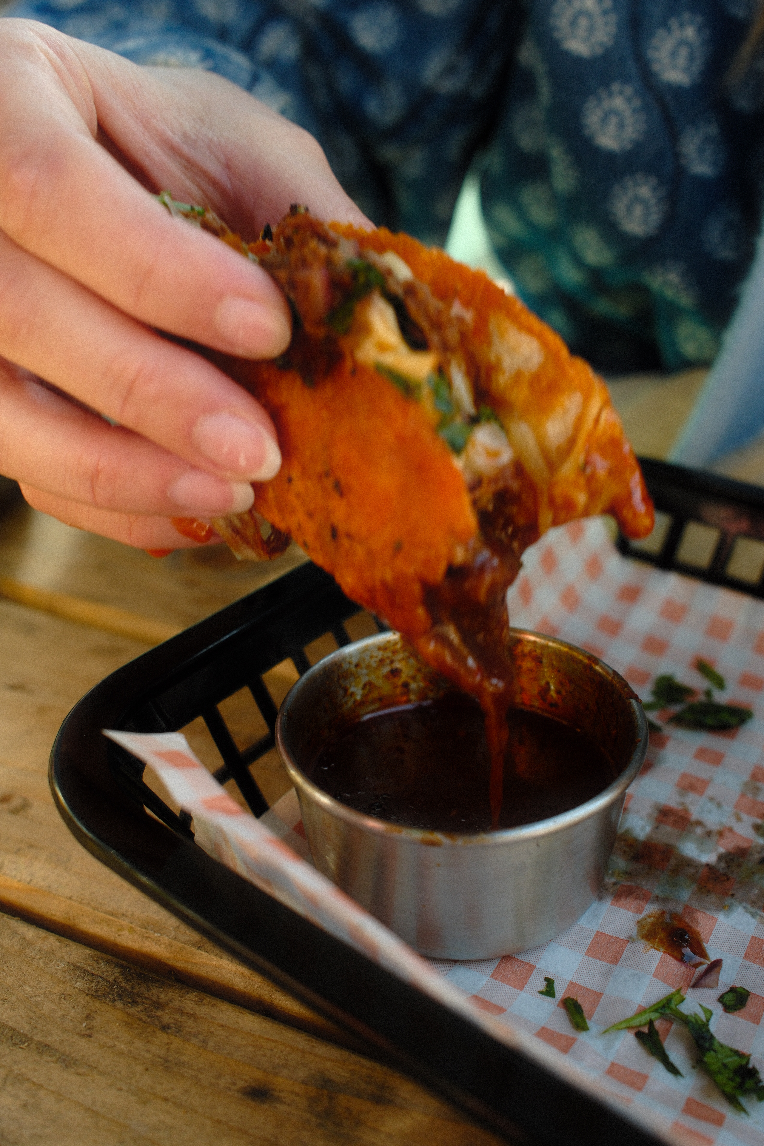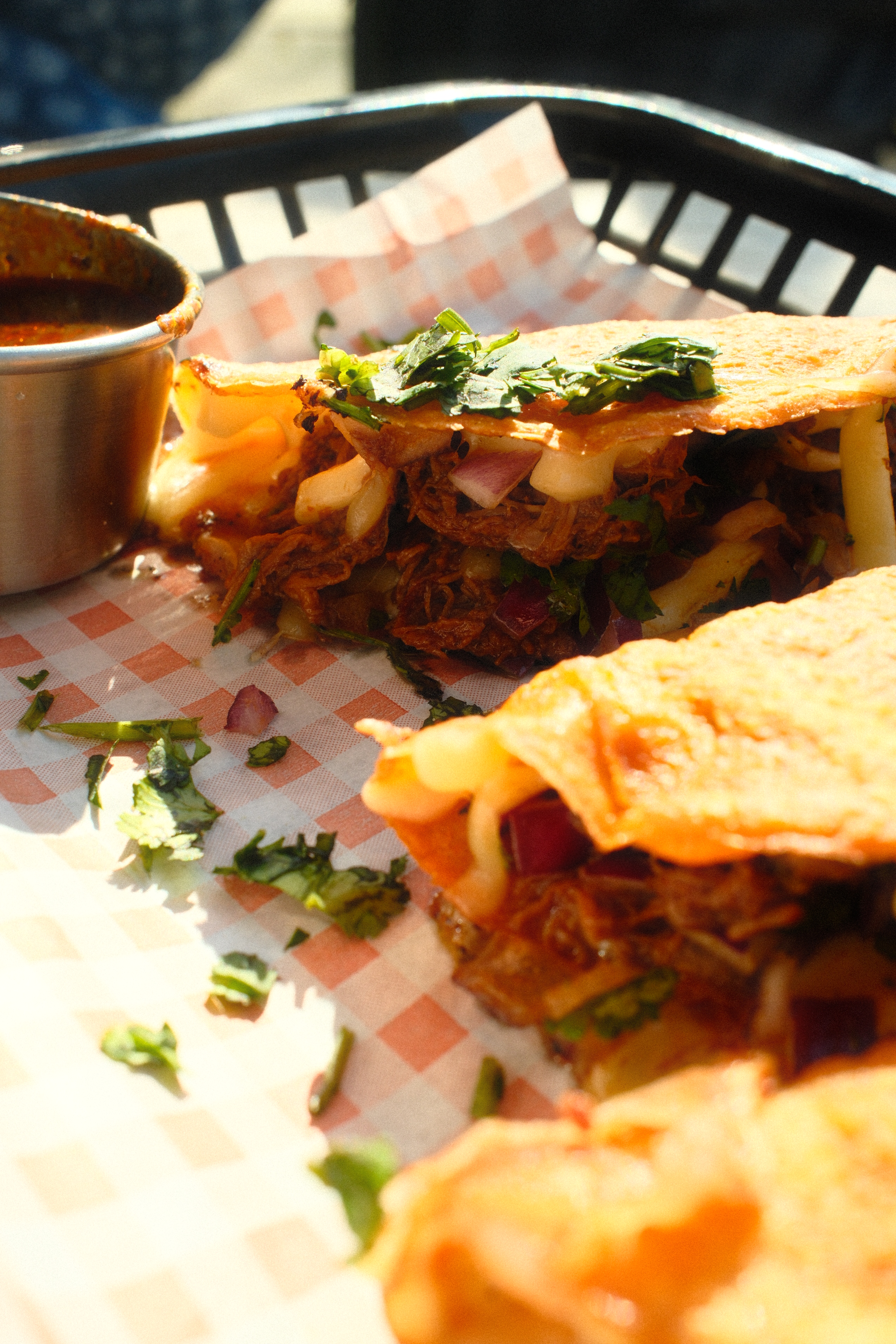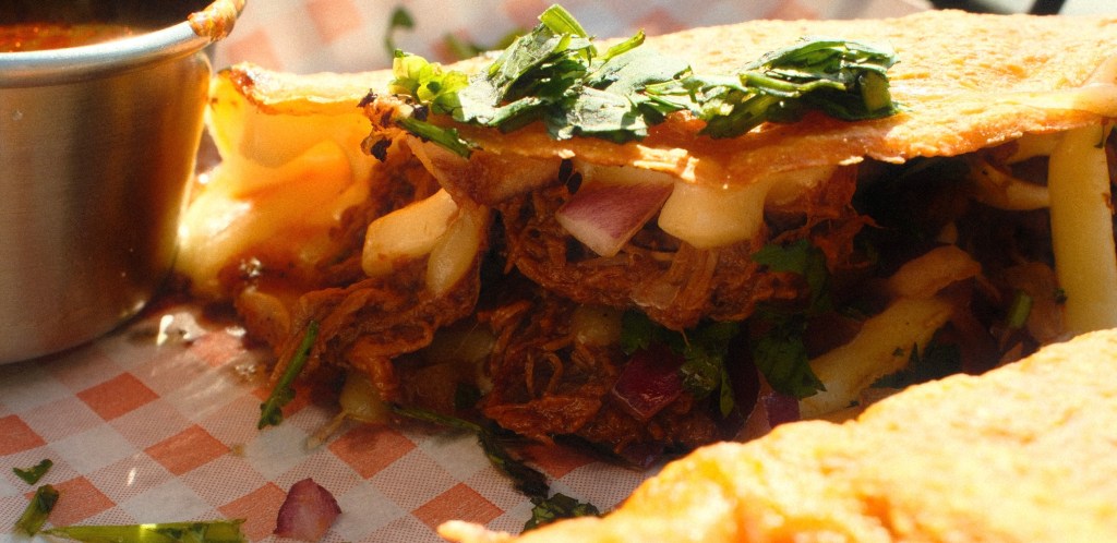 Melt in your mouth beef, cooked in smokey Mexican chillies and stuffed in a fried tortilla with mozzarella cheese, coriander & red onion …the best part – a pot of consommé for dunking.