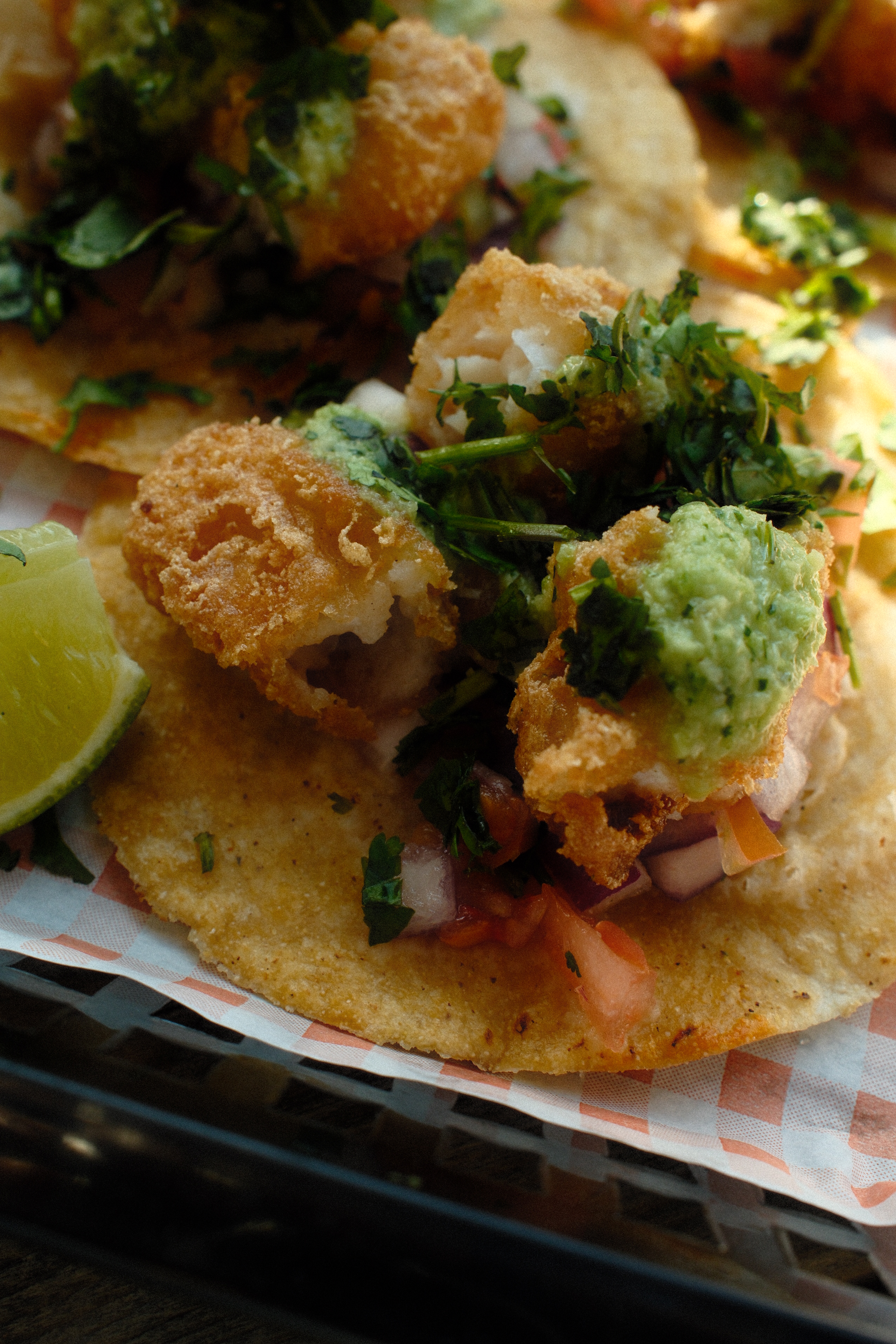 A classic taco choice. Battered cod on a bed of pico de gallo, topped with jalapeño salsa. Fresh and zingy with the moreish crunch of the fried cod.
